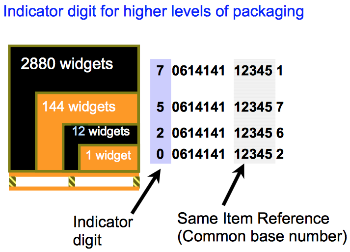 The packaging level (the "indicator digit" in the graphic above) is the first number, an arbitrary number that can be any value between 1 and 7 (then you let your trading partners know the values you're using). We suggest using higher numbers for "bigger" cases. So, for example, "2" could be the case of 12 document scanners, and "5" could be the palette.